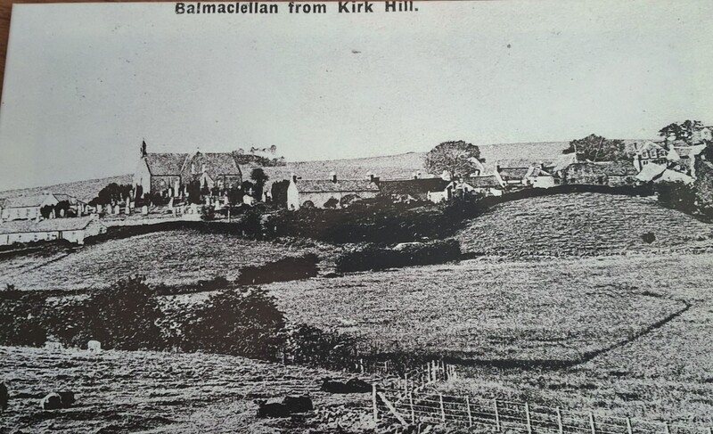 Black and white photo of Balmaclellan looking towards Kirk Hill