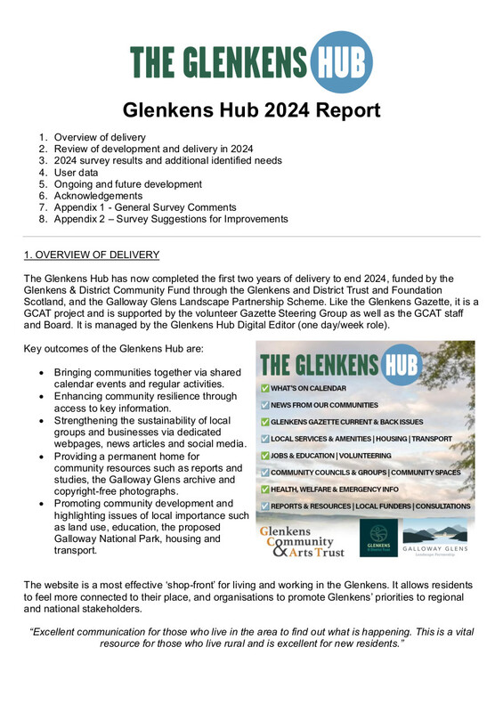 Throughout its second year of delivery, the Glenkens Hub sought to support the local community by amplifying news and events and reflecting the issues of most importance. This report includes results from the 2024 survey, user data and plans for future development to meet identified needs.