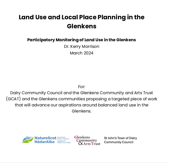 Dalry Community Council with GCAT commissioned three complementary reports studying Land Use and Local Place Planning in the Glenkens. The studies were funded by SoSE and Nature Scot, to set out the next steps required to embed land use considerations in the Glenkens into the medium term.