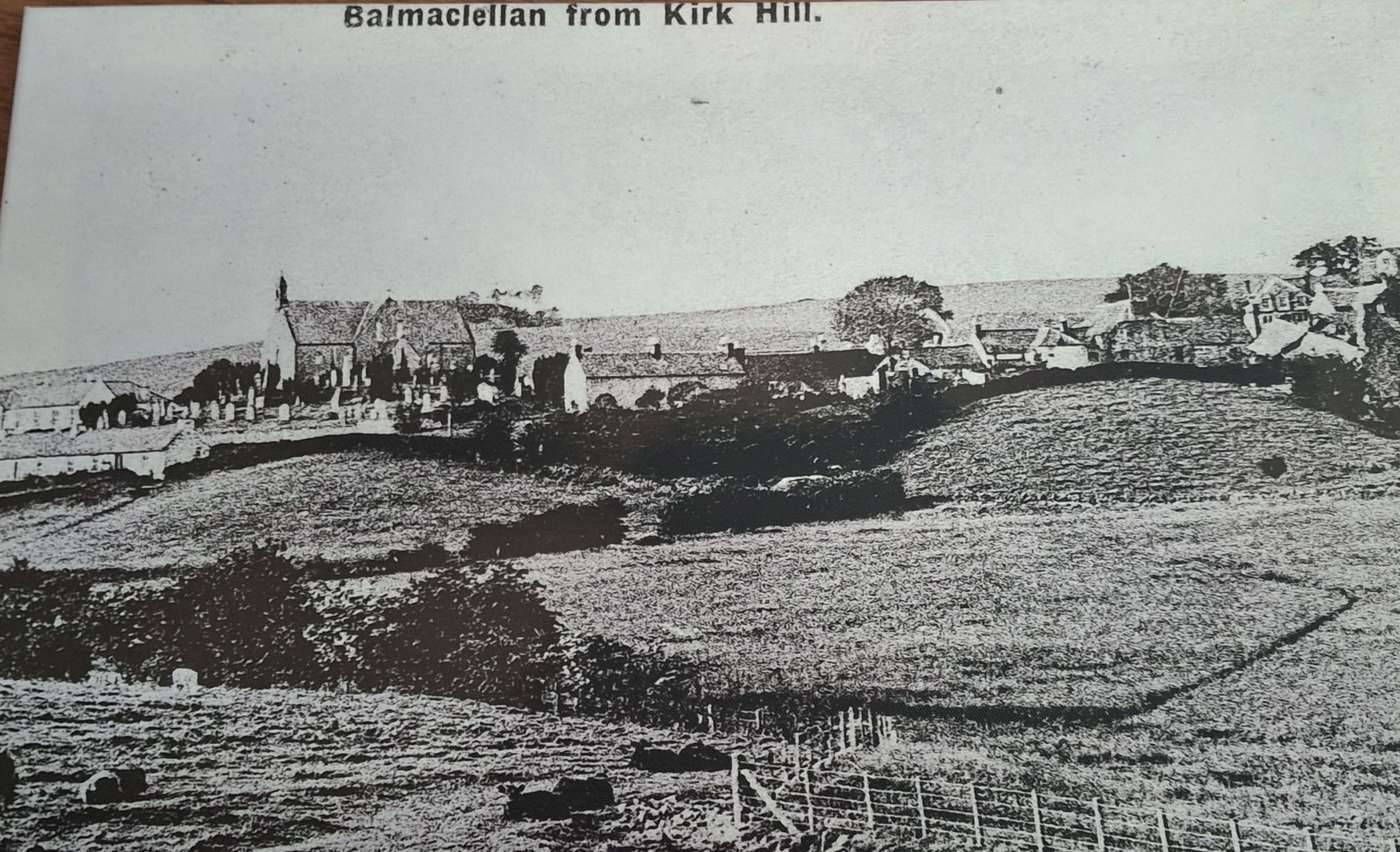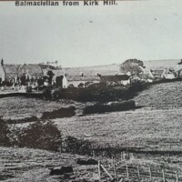 Black and white photo of Balmaclellan looking towards Kirk Hill