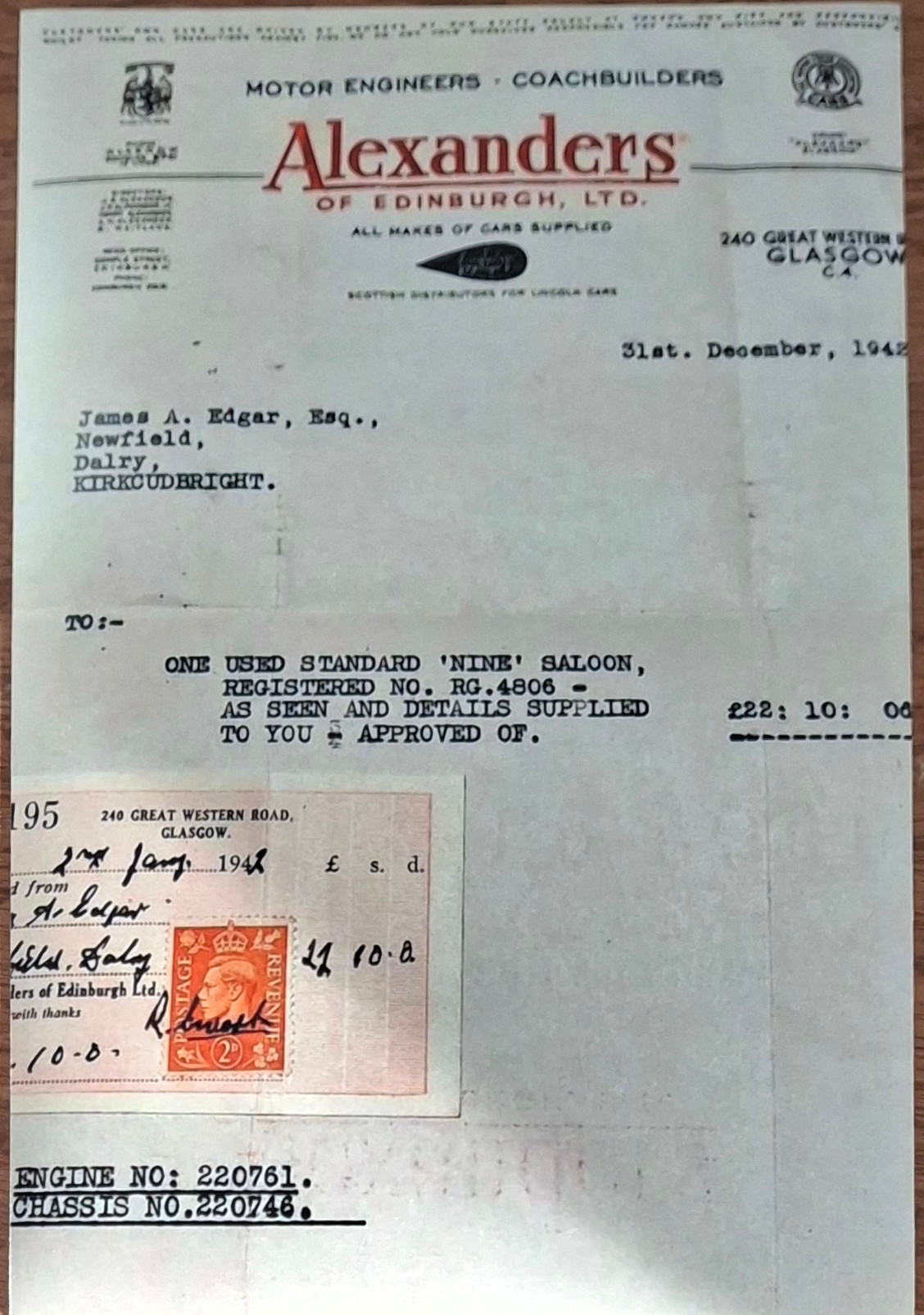 Alexanders of Edinburgh Account and photo of car sold to James Edgar of Dalry