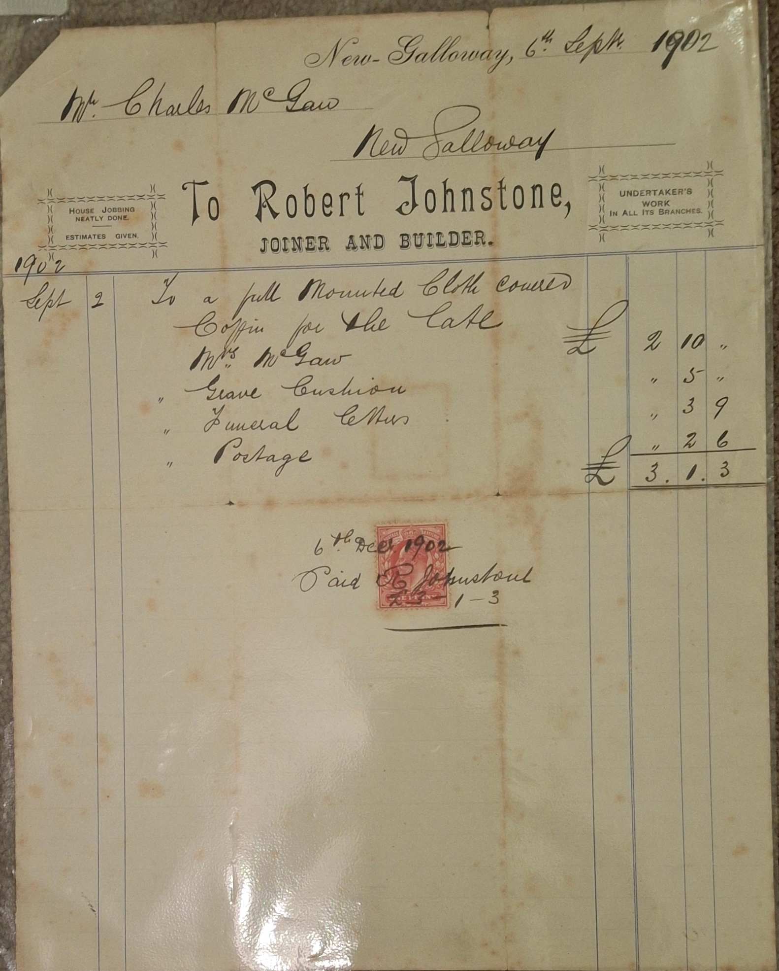 Invoice from Robert Johnston, Joiner & Builder, 1902.