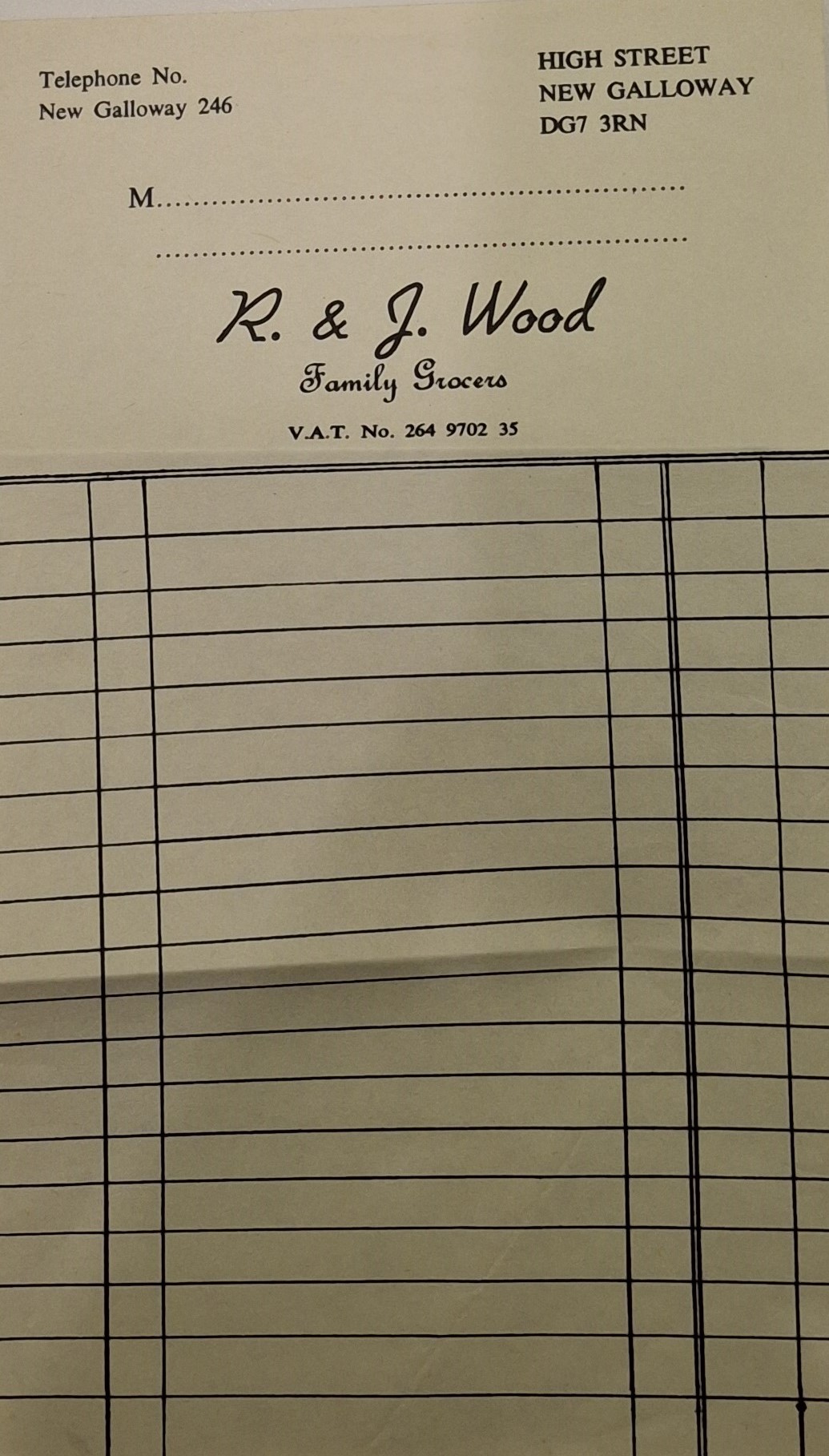 Blank invoice for R & J Wood, Family Grocers, High Street, New Galloway