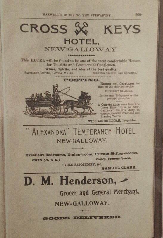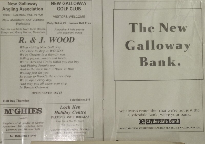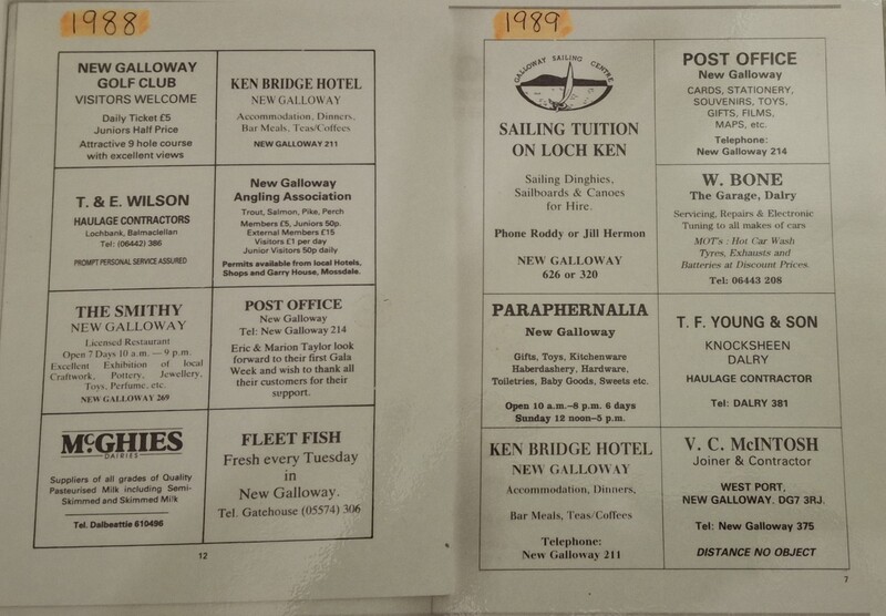 New Galloway Post Office; Sailing Tuition on Loch Ken; Ken Bridge Hotel; T F Young & Son, Haulage Contractors; V C McIntosh,Joiner & Contractor; The Smithy; T & E Wilson, Haulage Contractors; Fleet Fish; McGhies; New Galloway Angling Association.
