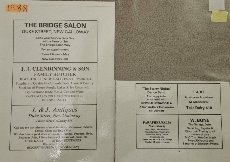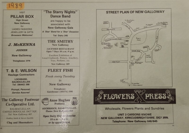 Pillar Box, Ladies Fashions; The Starry Night Band; J McKenna, Joiner; The Smithy; T & E Wilson, Haulage Contractors; Fleet Fish; The Galloway Co-Operative Footwear; Anne Hughes Pottery; Flower Press and New Galloway Street Plan.