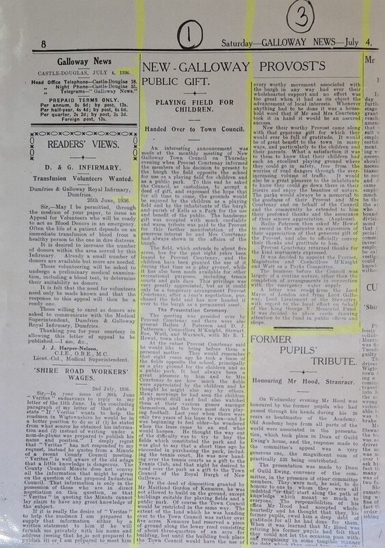 Photograph of a newspaper cutting documenting the gifting of the New Galloway Playing fields by the Town Council