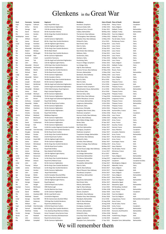 Roll of 82 service men, researched and compiled by Paul Goodwin. This document is now an official war memorial with the original being held by the D&G library service archive. The original is listed by the Imperial War Museum as WMR 80051.